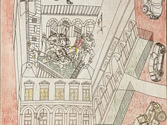 À partir de scènes isolées pensées dès 2014, l’artiste recompose inlassablement, au moyen de dessins préparatoires sur papier calque, de grandes fresques traversées par les mêmes objets de questionnements. Cela donne une œuvre titanesque tant il y a d’éléments qui accrochent le regard, une multitude de personnages qui y fourmille.
