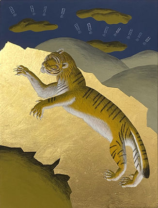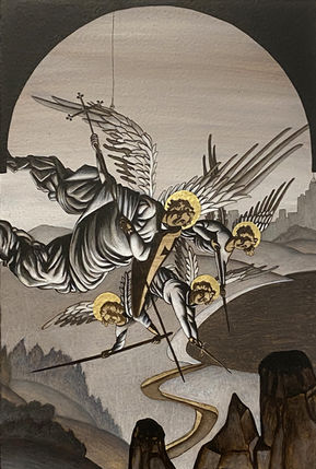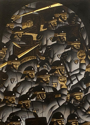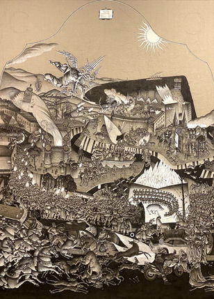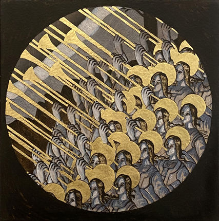 Réduire les sources d’inspiration de Thibaut Huchard au Moyen Âge serait injuste car sa curiosité artistique le porte bien au-delà de cette longue période historique qui va du Ve au XIVe siècles. Il puise aussi bien chez Jean Fouquet, Jan Van Eyck et Paolo Uccello que, beaucoup plus proche de nous, Leon Golub. Cependant, c’est dans les représentations médiévales grouillant de personnages pris dans une perspective approximative qu’il choisit, non sans malice, de poser son regard sur les conflits qui traversent le monde d’aujourd’hui. L’incendie de Notre-Dame de Paris prend ainsi des allures de combats urbains contemporains, même si ses drakkars rappellent la conquête normande de l’Angleterre figurant sur la tapisserie de Bayeux. Une manière toute particulière de dénoncer les situations actuelles, leurs fausses vérités et leurs débats d’opinion, en utilisant un langage du passé, distancié, et laissant place à toutes les interprétations possibles.